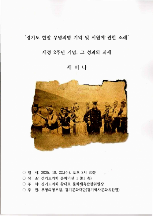 '경기도 무명의병 기억 및 지원에 관한 조례' 제정 2주년 기념 , 그 성과와 과제 학술세미나 작성자관리자 등록일 25-10-23 조회75회 연월일2025.10.22. 주최경기도의회 황대호 문화관광체육위원장 주관무명의병포럼, 경기문화재단(경기역사문화유산원) 본문 20 첨부파일 경기도의회 무명의병 세미나 자료집최종본, 20251021.pdf (264.8K) '무명의병과 국회독립기억광장, 잊힌 희생에서 국민의 기억으로' 학술세미나 경기도 문화원이 지역학연구 플랫폼이 될 수 있는가? 목록