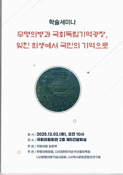 '무명의병과 국회독립기억광장, 잊힌 희생에서 국민의 기억으로' 학술세미나 작성자관리자 등록일 25-12-03 조회32회 연월일2025.12.02. 주최국회의원 김준혁 주관무명의병포럼, (사)역사문화콘텐츠연구원 등 본문 '경기도 무명의병 기억 및 지원에 관한 조례' 제정 2주년 기념 , 그 성과와 과제 학술세미나 목록